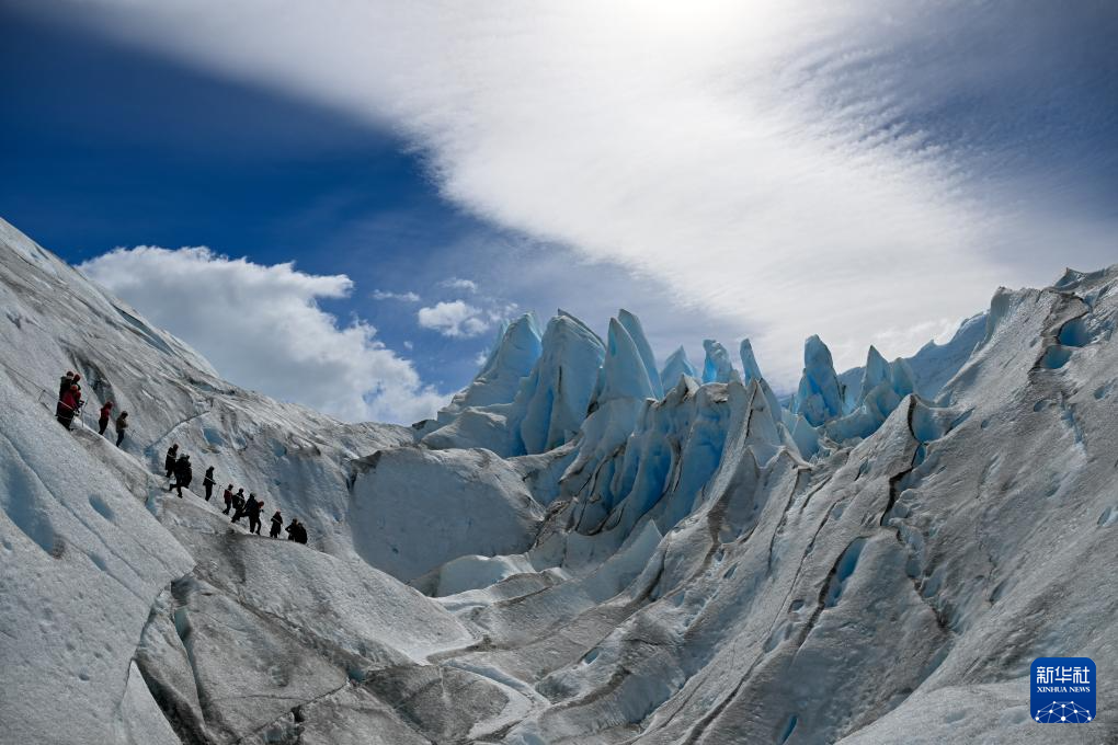 1月3日,游客在阿根廷圣克魯斯省冰川國(guó)家公園內(nèi)的莫雷諾冰川上行走。